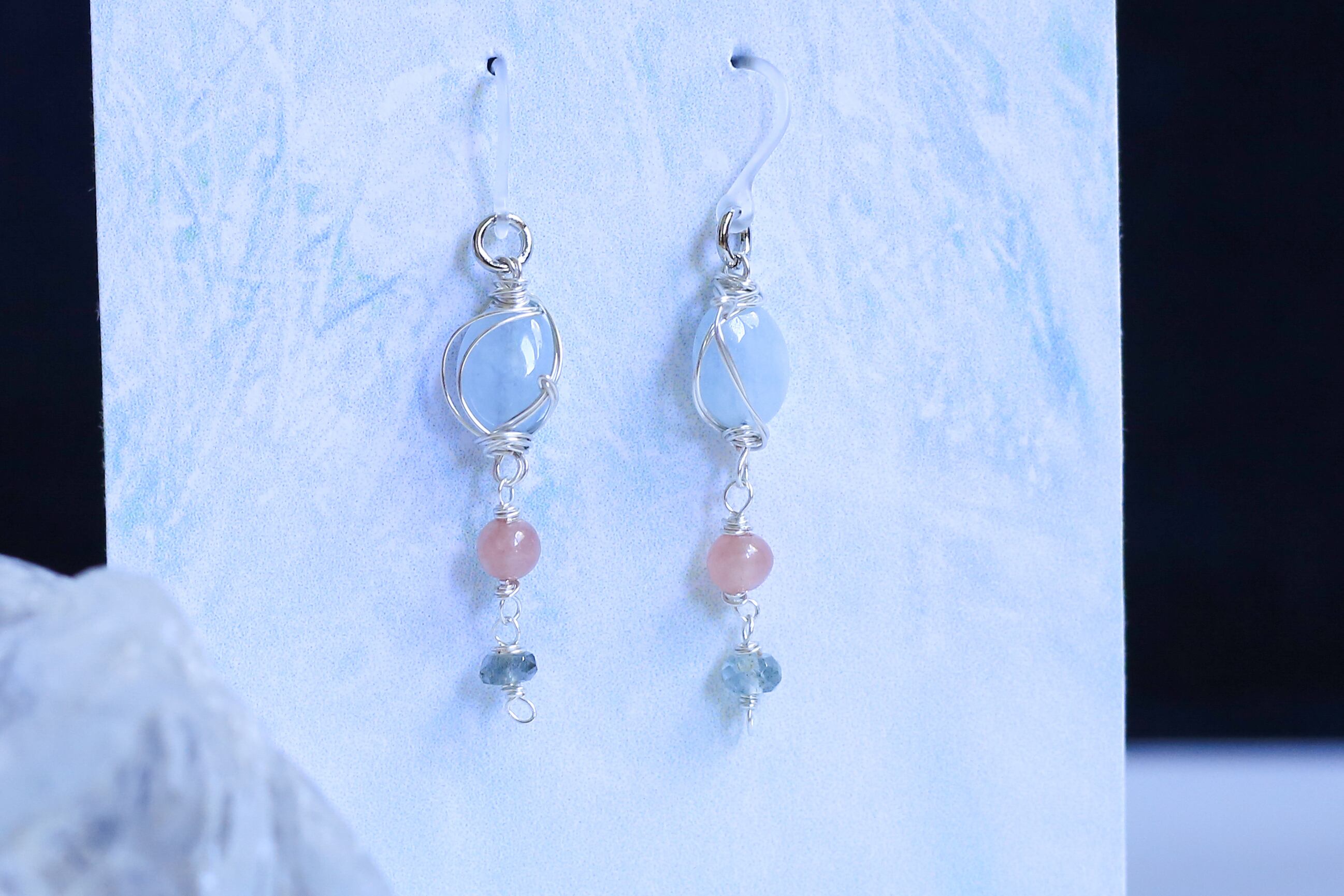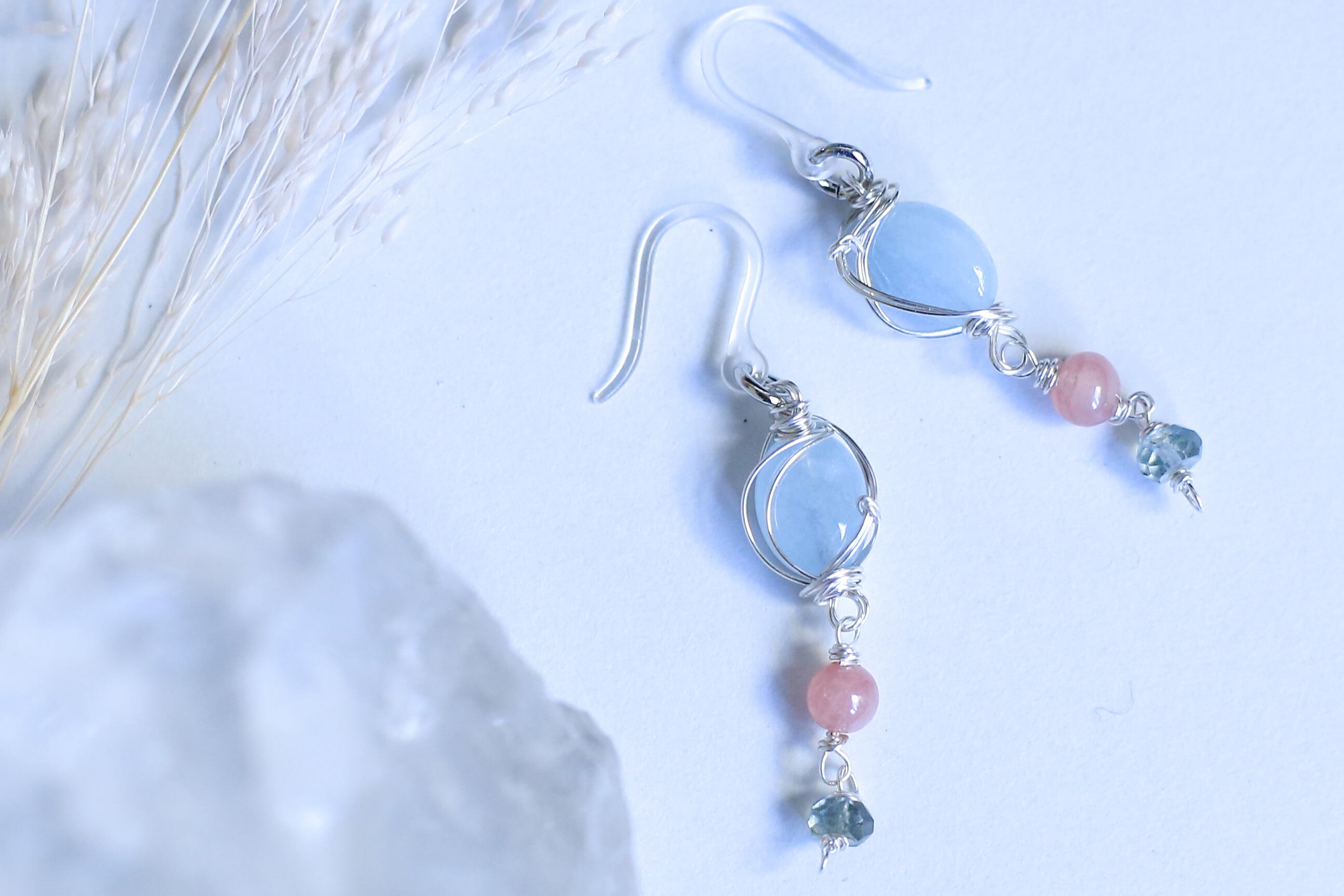 金属アレルギー対応 ワイヤーアート 天然石ピアス アクアマリン・インカローズ・モスアクアマリン