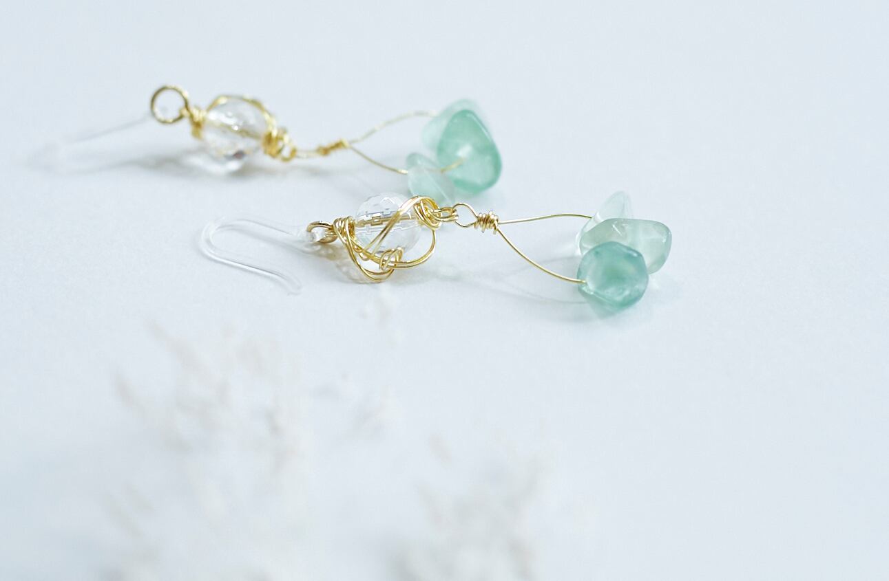 金属アレルギー対応 ワイヤーアート 天然石ピアス ミルキークォーツ・フローライト